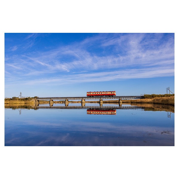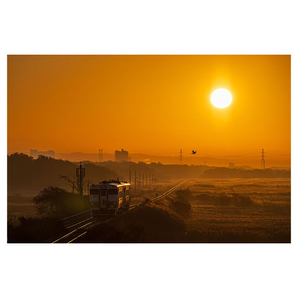 苫小牧発鵡川行き始発列車“キハ40系”気動車。冷え込んだ朝、勇払原野の彼方から朝陽が昇り1日の始まりを告げる写真ラベル。 北海道の契約生産者の厳選した北海道産酒造好適米と日高山脈を源とする何度も日本一の清流に輝いた札内川水系の中硬水を原料に、穏やかな香りで味わい豊かな純米酒です。